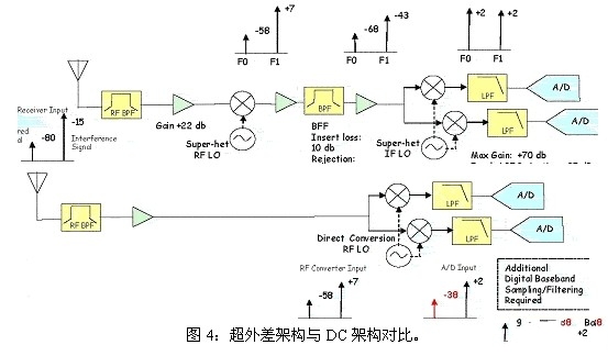 图4将超外差接收机架构与DC接收机架构之间的差别进行了对比。此示例假设源自无绳电话的相邻窄带强干扰为-15dBm,并且接收的WLAN信号级别的目标是-80dBm。也就是说在干扰与WLAN信号之间的接收功率相差将近65dBm。这种情况很容易发生,如某用户可能一边在与本地WLAN相连的便携电脑上进行工作,一边用无绳电话聊天。
