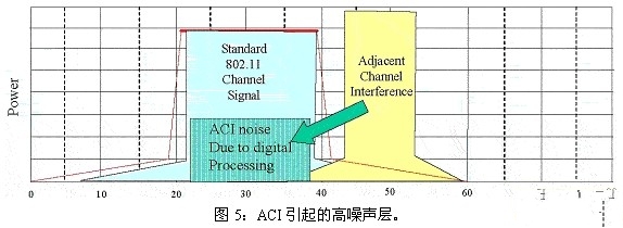 显然,由商用无线设备生成的信号不尽完美。的确,从802.11射频发出的信号生成超出其许可频带范围的一些能量,称之为边带发射。这种情况也会出现在其他无线设备上,如蓝牙、无绳电话以及其他与802.11占用相同频带的设备。虽然通过过滤可以将来自相邻信道的RF干扰降至最低,但是此干扰还会生成旁瓣能量(sidelobeenergy),此能量属于802.11WLAN信号的通频带范围内。如果ACI比802.11信号强,来自ACI的边带能量将主导信道的噪声层。如图2所示。