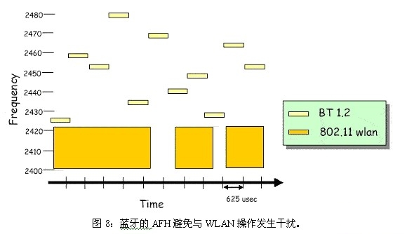 但是问题随之而来:在采用WLAN与蓝牙技术的汇聚设备中,WLAN是否能够从AP不断接收下载内容,而不必考虑该设备蓝牙子系统的操作模式?经过对蓝牙实施制定仔细的设计、规划与部署决策,答案是肯定的。首先,设计人员必须利用蓝牙1。2的功率控制(第3类设备)功能,以及蓝牙的自适应跳频(AFH)。下面的图8展示了AFH如何避免与WLAN操作发生直接的带内干扰。