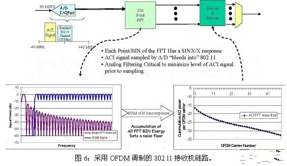 对于已经实施OFDM调制方案的WLAN来说,从一个频率接收器到另一个频率接收器的往返传输过程中,接收机链路中的快速傅里叶变换(FFT)已经有所损耗。从而导致带外抑制层平均大约为25dB。图6解释了每个FFT接收器的SinX/X响应。