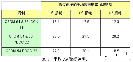 值得一提的是,通过具有22-MbpsAP的802.11电池(采用TI开发的PBCC调制方案)的平均数据吞吐量非常合理。表3显示了在不同级别的信号传播损耗下,不同调制的平均数据吞吐速率。假设在大多数现有设置的情况下,信号损耗通常为R3。最重要的是,从表3中可以看出,在整个电池上,PBCC的平均数据速率几乎比CCK调制高出了一倍。PBCC与CCK具有相同的灵敏度,因此也具有相同的范围。此外,从这些平均数据速率图形中可以看出,当一个电池中采用多种调制方案时,可以使吞吐量稍微提高5%至10%。借助多个调制方案,可以为客户提供最佳的数据速率及范围。PBCC调制的802.11b具有相同的SNR。