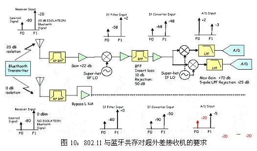 2)在蓝牙与802.11之间存在0dB的隔离,但是系统能够在RF接收机链路中断开LNA。系统并不具有功率控制功能。