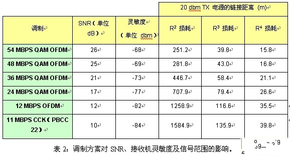 表2显示了802.11g与802.11b的不同调制方案如何影响SNR、接收机灵敏度及信号范围。请注意,采用CCK调制的802.11b与采用PBCC调制的802.11b具有相同的SNR。