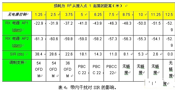 表4对图11中所示的两个AP的带内干扰问题进行了定量分析。这一分析假设未实施任何技术(如电源控制)来缓解某些问题。表4中的数据来源于两个802.11AP的一般城区部署。这两个AP的发射功率均为20dBm,它们相隔的距离为25米(大约75英尺),并且它们的信号传播损耗为R3。根据每个AP到这两者中点的距离来分析SIR。表4显示了不同距离的SIR以及各SIR级所支持的数据速率。