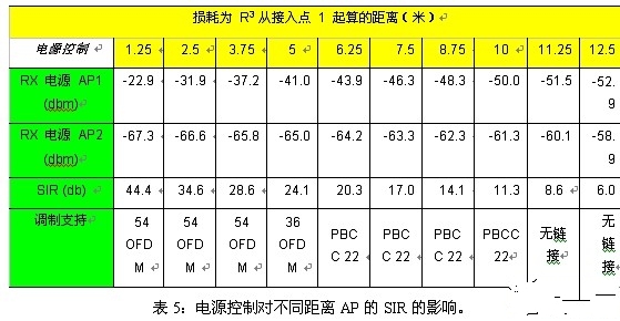 表5显示了电源控制技术对不同距离AP的SIR以及各SIR级支持的相应调制功能的影响。