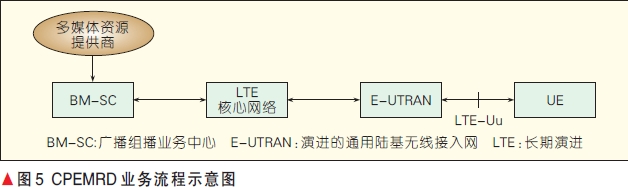 如图5 所示,我们可以看到CPEMRD 系统的基本业务流程:多媒体资源提供商提供多媒体内容,经过M-SC 将传输流转发给LTE 核心网,并进一步转发给演进的通用陆基无线接入网(E-UTRAN),最终通过LTE-Uu 接口发送到用户终端UE。