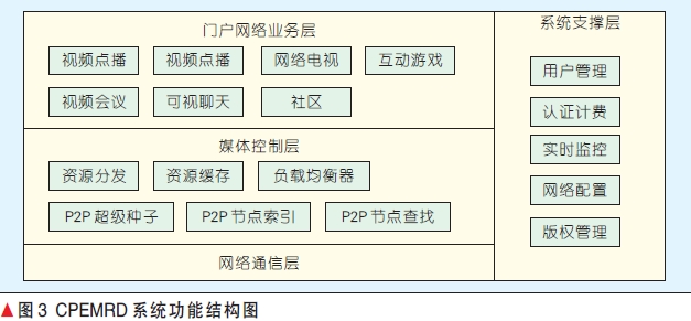 由于流媒体具有松耦合、高扩展性的特点,从多媒体资源分发系统的体系结构的垂直控制功能上来看,一个典型的多媒体资源分发系统架构应采用分层模式,这使得平台系统上的应用开发能够根据不断变化的业务应用需求而快速扩展。CPEMRD系统从功能结构和软件层次上看,在LTE 环境下可以通过设置4 层体系结构来支持多媒体应用:网络通信层,媒体控制层、门户网站业务层以及系统支撑层,如图3 所示。