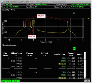 R&S公司提供的多种信号分析仪FSW,FSQ,FSV等都可以对LTE/LTE-A信号进行解调,以LTE-A为例,图7中显示的是对上一节中SMU200A产生的LTE-A信号的测试结果,发射配置是PUCCH和PUSCH同时发射,且PUSCH分簇发射。从图7中可以看到,信号分析仪能够正确解调出PUSCH和PUCCH信号的功率、EVM等指标。