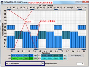 再例如LTE-A的上行方向, 要求能够实现PUSCH分簇,并且支持PUSCH/PUCCH同时发送,图5是R&S的信号源SMU200A产生LTE-A信号时,同时生成的资源分布图,通过该图能够看到,SMU200A能够轻松实现这些特性。