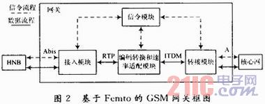 本文所设计基于Femto的GSM网关框图如图2所示,可分为接入模块、信令模块、编码转换和速率适配模块、转换模块。