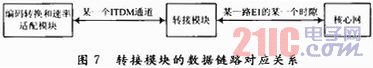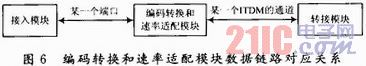 编码转换和速率适配模块是专门用于数据处理的一个模块。由于在GSM系统当中,Abis口用户的语音数据有全速率,增强型全速率,半速率和自适应速率等类型,且每种类型的数据速率也不一样。而在A接口侧,给每个用户的信道是一路E1的某一个时隙,它的速率是固定的64 Kb/s,因此需要一个专门的模块用来处理这个任务,编码转换和速率适配模块就是为此而设它能根据信令模块的通知为一个用户在两侧建立好数据通路,由信令模块告知每个用户的编解码方式,使得这个模块能根据不同用户的数据类型而选择合适的编解码算法进行速率的适配。在这个模块内部要维护一个映射表,对每一个UE来说,到接入模块要用一个端口,到转接模块要用到一个ITDM的通道,因此,在数据面上,存在这两者之间的映射关系如图6所示。