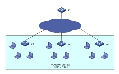 这种情况下如果将所有的用户分配在一个VLAN中,意味着所有用户在同一个子网中,庞大的广播域会大大增加空口中的广播流量,浪费空口带宽。另一方面,大量用户在同一子网中,那么该子网需要一个很大的连续地址空间。企业可能会有多个不连续的C类地址,但没有大的连续地址空间(如B类地址)。显然,我们无法利用一个VLAN来为大量的同一类用户来分配不连续的地址空间。