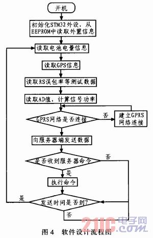 开机后系统进行初始化,包括STM32各个外设的初始化、从EEPROM中读取系统之前设置的参数值、对MXL5007和IF206的初始化。系统初始化完成后分别读取太阳能蓄电池剩余电量信息、GPS信息、RS误包率、LDPC误码率、信号平均等信息,之后判断是否与服务器建立连接,连接建立成功后按照设定时间间隔定时向服务器上传这些数据;与此同时时刻查收来自服务器端的命令信息,如设定更改信息上传时间间隔、各参数门限值、调谐及解调芯片的频点等,参数被修改后立即被存入EEPROM中,防止断电信息丢失,下次开机后这些参数再次被读取出来。
