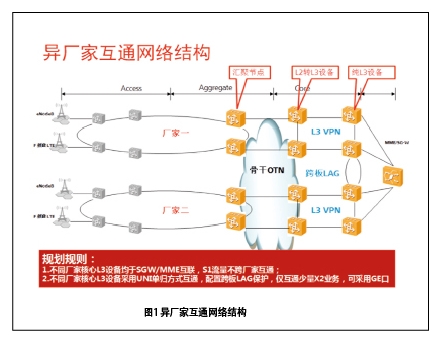 在整体网络架构上根据全省核心网机房部署情况,分为是否有SGW和MME,或者只有其一的情况。各地市的X2流量,在各自区域内的L3 VPN或是L2设备上进行交换转发;S1流量在地市有SGW和MME情况下,通过本地L3 VPN在本地核心网设备落地交换;没有SGW和MME的地市,则通过骨干网进行业务调度,落地到拥有SGW和MME的地市。同厂家情况下:各地市内网络架构按照L2+L3VPN的方式进行部署;异厂家情况下:考虑到S1流量互不相通,只存在X2流量的跨区域转发,因此在核心层直接对接SGW,并在L3VPN内,通过UNI接口进行对接,使用跨板LAG保护(如图1)。