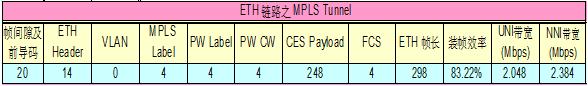 PTN网络中E1承载效率可按如下公式计算:CES paylaod/帧格式总字节数,其中CES的paylaod长度和E1时隙个数以及装帧时间有关。在CESoPSN模式下,E1时隙个数为31、装帧时间为1ms,ETH 链路为例,其装帧效率如下: