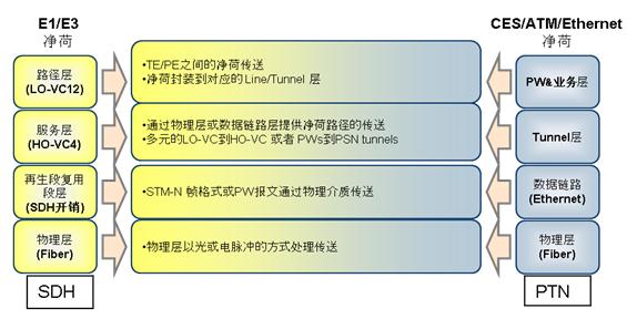 在GSM业务的告警处理上,PTN的告警分为物理层、数据链路层、Tunnel层、PW层、仿真业务层五个层次。对应SDH的物理层、段层、线缆层、路径层。上层功能的实现依赖于相邻下层提供的服务。低层与高层同时有故障产生时,低层故障的消除是处理高层故障的基础,物理层故障引发的告警屏蔽其它层故障引发的告警。SDH告警与PTN告警最根本的区别在于SDH告警都是由字节承载上报的,而PTN告警则是由协议控制上报的;但都有其相似之处,如下图: