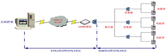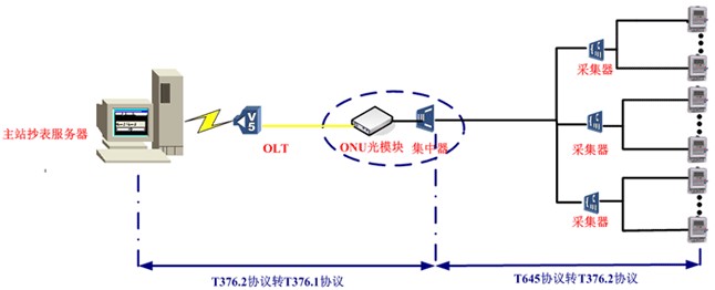 电能表至电能表模块之间采用T645协议,电能表模块至采集器和集中器模块之间采用T376.2协议,集中器模块至ONU模块和主站之间采用T376.1协议,ONU模块在之间只起着透传作用。集中器模块负责协议转换,ONU模块并不做任何协议处理,只负责透传。