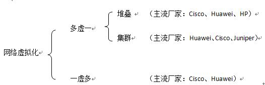 网络设备多虚一虚拟化技术分为两种。一种是基于低端交换机的堆叠技术,另一种是基于高端路由器的集群技术。