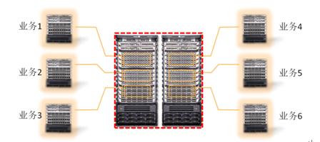 例如,当采用核心交换机虚拟化成多台设备,供多个业务隔离使用。但一台交换机的硬件资源(如端口数量)不足时,可以将两台核心交换机先按多虚一的方式做成一台设备,然后再将此“一台”设备进行一虚多处理。这样,两台物理设备的资源就可以加在一起而进行统一分配。如下图所示。