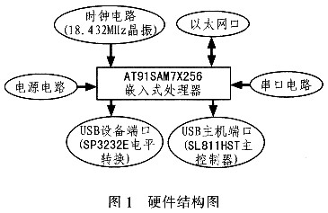 该系统硬件设计是由电源、复位、时钟电路、以太网口、USB主机和设备端口以及串口组成,其结构框图如图1所示。其中,以太网口用于将设备接入网络实行远程管理和监控。将设备的数据接入Internet,实现远程监控,适用于工矿企业设备的集中化管理和维护。USB主机端口通过主机控制器SL811HS/T与控制器AT9lSAM7X256相连,进行数据通信。USB设备端口作为与PC机通信的接口。该系统设计的创新在于该设备抛开了PC机,既可作为主机,也可作为外设,并与其他0TG设备直接实现点对点通信。