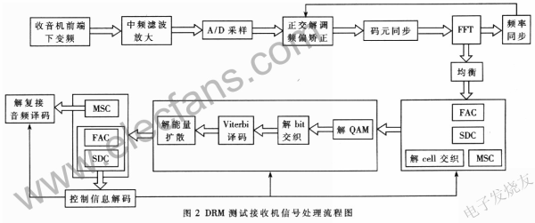 按图2所示流程,从均衡后的数据中提取FAC单元并将其解码,得到解调SDC的信息;再提取SDC单元,根据FAC的信息解码SDC,得到SDC数据实体;最后提取MSC,根据FACSDC的信息解码MSC。上述单元分别经过解交织、解OAM映射、Viterbi译码、能量解扰等模块的处理后,最后将MSC解复接后的数据进行音频译码或者数据解码。