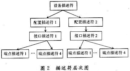 描述符主要是让上位机了解USB功能设备的基本配置信息和能力,如端点、接口等。在此主要使用标准描述符来说明USB设备,如设备描述符、配置描述符、接口描述符、端点描述符、设备限定描述符等。在该设备中,这些描述符的层次结构如图2所示。