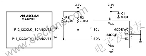 本文介绍了如何通过MAX2990电力线通信调制解调器的I2C接口与外部EEPROM 24C04连接,并给出了相应的固件例程。I²C总线受控于MAX2990 (主机),24C04 EEPROM为从机器件。以下框图给出了本文示例的硬件配置。