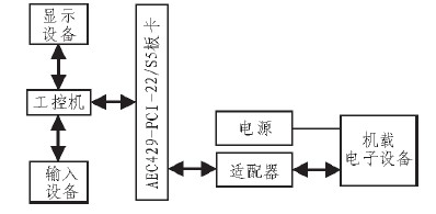 将AEC429-PCI-22/S5接口卡的每个发送通道和接收通道分别作为总线数据仿真系统的的模拟输入及输出端口,也可直接与相应的检测设备相连进行总线数据通讯,按照ARINC429协议采用屏蔽双绞电缆,利用特定的适配器,实现对机载电子设备的指令数据的模拟输入及工作状态数据和故障信息的查询。由于不同的机载电子设备具有不同的通讯协议及硬件接口,故配合系统软件设计,系统还根据不同设备的特点,设计了特定的适配器,以满足多型设备总线数据发送、采集及故障诊断的需要。如图3所示。