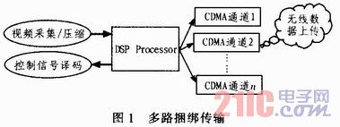 CDMA 1X系统的标称峰值速率为153.6 kbit/s。而在实际应用中CDMA的上传速率在一般的应用中只能达到50~60 kbit/s左右,远无法达到峰值。因此,无线数据传输技术所能输送的数据量不能太大,否则会造成数据丢失而达不到传输的最初目的。为了提升传输速率,系统利用多通道数据传输技术,捆绑多个CDMA链路通道,同时在传输控制中结合使用多路捆绑处理技术,以及H.264+压缩复用技术,如图1所示。