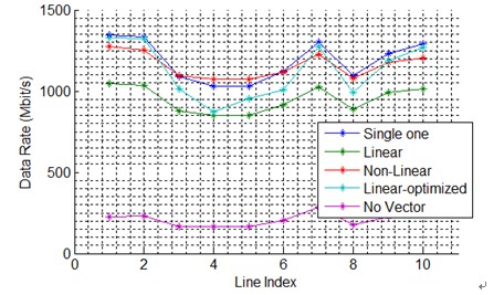 目前G.fast用到的Vectoring技术方案有两种,一种是改进的线性预编码算法,另一种是非线性预编码算法。非线性算法在高频部分的增益比线性算法有较大提高,但在低频部分的增益与线性算法性能接近。从图1的仿真结果可以看出,多数线缆非线性算法的带宽比线性算法高,但也有个别线缆相差不大甚至不如线性算法。由于非线性算法对处理器的性能要求大大超过线性算法,导致实现难度、功耗和成本大大提高。标准组织发布的第一版标准会采用线性预编码算法。