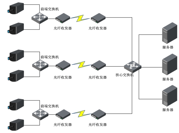 网络传输子系统主要包括交换机、光传输设备等,实现前端采集子系统与中心管理子系统之间的数据和图像信息传输。建设光纤链路作为前端与中心的数据传输通道,保证数据传输的实时性和可靠性。本次项目将全部采用光纤传输方式。