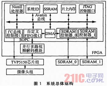 整个系统主要分为SOPC系统、多路视频解码模块、视频A/D芯片绢、SDRAM存储器几大模块。SOPC系统和多路视频解码模块均由FPGA可编程逻辑资源实现。SOPC系统通过自定义FIFO(Custom FIFO)缓冲来自多路视频解码模块(Multi-channel Video Decoder Module)的数据,DMA完成数据从Custom FIFO到SDRAM的搬移工作,NiosII CPU通过Avalon总线对视频A/D采集芯片、自定义FIFO接口模块以及DMA控制器进行配置。系统总体结构如图1所示。