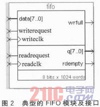 自定义存储接口模块以FIFO IP Core为核心,通过与Avalon总线协议匹配,接收NiosII处理器的控制信号。该模块利用QuartusII中Mega Wizard Plug-In Manager实例化FIFO IP Core,根据数据格式和系统资源综合考虑,FIFO的数据宽度为8位,FIFO深度为1024。在这里保留FI FO IP Core的读时钟信号readclk、读请求信号readrequest、8位读取数据接口q[7:0]、8位写入数据接口 data[7:0]、写时钟信号writec lk、写请求信号writerequest以及FIFO空状态信号rdempty。实例化后的FIFO模块如图2所示。