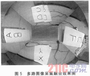 为检验高速多路视频数据采集系统的图像采集效果,系统外接4路摄像头同时采集图像数据,在实际视频数据采集过程中,多路视频图像显示连贯流畅。将存储在SDRAM中的图像数据读取后,通过后期融合算法,融合成环境平面图像,实际多路图像采集融合效果如图5所示。