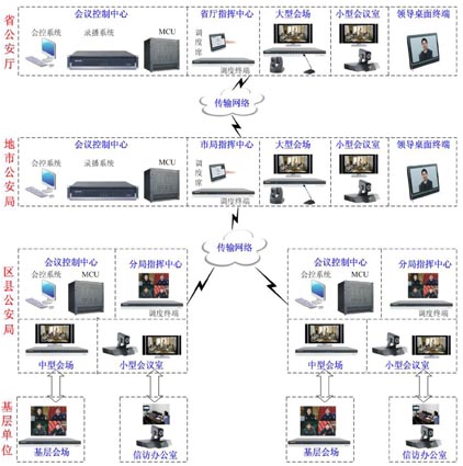 (1)系统组网图1所示,系统基于省公安IP数据专网,采用H.323(或H.320)体系标准,以省公安厅为二级网控制中心和主会场,地市公安局为三级网控制中心和三级网主会场,区县分局为接入网控制中心和主会场,各基层派出所单位为接入网分会场。
