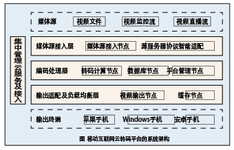 移动互联网云转码平台的系统架构包括以下三层功能,并实现统一的云服务接入、云资源调度和云平台管理。
