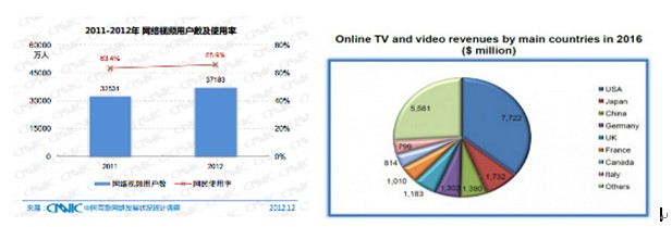 图1:2013.1 CNNIC 中国互联网调查报告 图2:2012年Digital TV Research调研