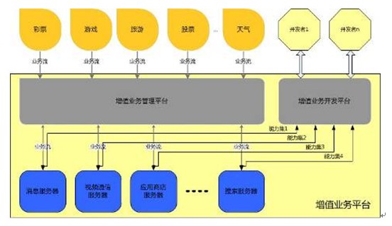 增值业务平台作为奔流互联网电视解决方案里一个重要平台,与增值业务提供商的增值业务服务器、机顶盒一起提供丰富的业务种类,将增值业务提供商的服务下发到并呈现到客户端,并管理用户以及提供商产生的各类信息。包括信息服务、消息系统、视频通信系统、搜索系统和游戏等等。同时,通过将各个增值业务服务器的能力集封装,向更多的第三方开放系统能力,提供增值业务开发接口,吸引更多的开发者来为互联网电视系统开发应用。增值业务平台要求具有可扩展性,可满足将来新型增值服务的实现、接入和运营需要。