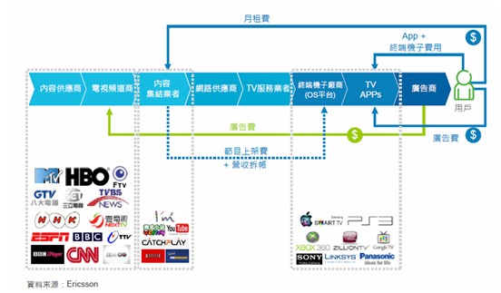 内容提供商 – 在传统的商业模式中,内容提供商提供代理或自制内容给电视台。内容提供商擅于制作内容,但是跟观众的距离非常远。收视率高的节目内容可以带来更高的收益,为电视台带来更高额的广告费用。