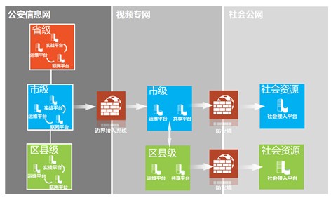 首先:各级平台间的联网需要遵循安全、稳定、可靠的数据传输要求。公安信息网和视频专网之间需要通过标准化的安全边界接入系统实现数据的安全;视频专网和社会面资源(社会公网)之间可以采用防火墙(或更安全的网闸方式)实现专网的安全;不同网络间的各级平台级联符合GB/T28181-2011的标准规范。