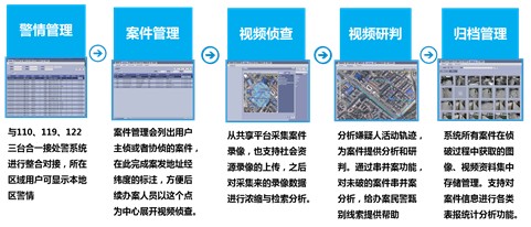 图像侦察过程中提供一种简单有效的方法帮助办案人员从海量的视频数据中甄别案件的有效线索信息,它主要包括:图像采集、浓缩与检索、轨迹时空分析、串并案分析、图像增强等。