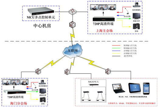 1、系统采用软硬件结合的模式。主要的会场采用硬件设备,保障系统稳定运行;经常出差的与会者不在会议室,用PC、智能手机、PAD、无线终端也能同样入会,在3G、4G、WIFI、卫星网络环境下即可高清晰的、流畅的视频通讯,方便差旅过程中的视频通信应用,有效地加强了会议的便捷性。