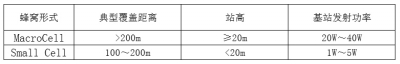 Small Cell小基站的称谓是相对于传统宏蜂窝基站即Macro Cell而言的。它们的划分标准取决于典型覆盖距离、站高和基站发射功率,以基站有效覆盖范围为主,业界对于二者的划分界定并不十分统一。目前国内行业标准尚未对小基站进行定义,业界一般将其分为瓦级产品(1W~10W,典型为5W)和毫瓦级产品(100mW~500mW,典型为100mW)两类。