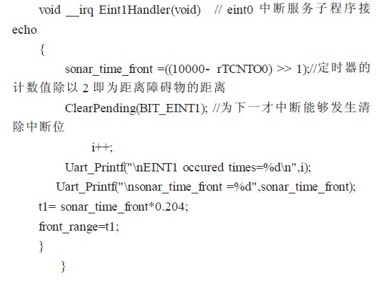 超声波的回波的检测是个难点,因为在ARM中一个端口设置中断只能设置一种触发方式,如果设为上升沿触发可以打开定时器定时但无法捕获下降沿,也就无法关闭定时器,从而不能测距,因此用软件的方式实现。首先设置两个时间延迟函数usdelay()和msdelay(),这样可以在给出高脉冲10us 后等超声波触发再打开定时期计时,在设置一个外部中断eint1 接到超声波传感器的echo 口并设置为下降沿触发,等下降沿来临关闭定时器读出值既为脉宽的时间长度,然后根据障碍物的距离=(ECHO高电平的时间)* 声纳速度/2 得出距离。空气中v 与温度关系:v=331.5√1+T/273 m/s,T 为摄氏温度。一般情况下超声波速近似声速,在室内温度影响下取约343.2m/s.