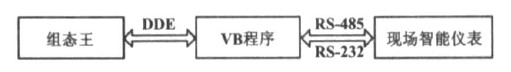 由图2可以看出,该系统的通信包括两部分:组态王与VB程序的DDE通信; VB 程序通过RS2232 /485 与现场智能仪表的通信。
