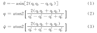 扩展卡尔曼滤波算法(Extended Kalman Filter, EKF)是一套由计算机实现的实时递推算法,所处理的对象是随机信号,利用系统噪声和观测噪声的统计特性,以系统的观测量作为滤波器的输入,以所要求的估计值(系统的状态变量)作为滤波器的输出,滤波器的输入和输出由时间更新和观测更新算法联系在一起,根据系统的状态方程和观测方程估算出所需要处理的信号。AHRS扩展卡尔曼滤波算法的状态变量采用四维四元数,与采用欧拉角相比,避免了采用欧拉角计算时涉及的大量三角函数运算,保证了更新速率和实时性,同时不存在采用欧拉角运算出现的奇异性。欧拉角与四元数的转换关系如式(1)~(3)所示。