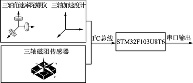 MEMS器件的AHRS硬件基本组成为三轴角速率陀螺仪、三轴加速度计、三轴磁阻传感器和STM32系列微处理器STM32F103U8T6。航向姿态参考系统的硬件结构如图1所示。