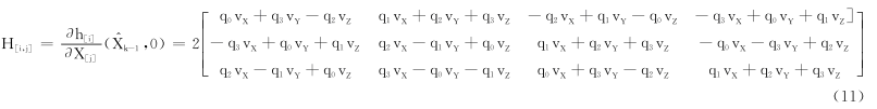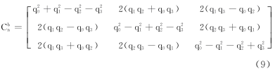 AHRS的观测更新是通过本体坐标系上的重力加速度和地磁场的参考矢量旋转至导航坐标系上,再与加速度和磁场传感器比较,得到观测变量的残余。由本体系转换至导航系的转移矩阵由四元数可以表示为式(9)。