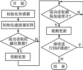 ④ 采集加速度传感器和磁阻传感器的数据,若读取成功则进行观测更新。加速度观测更新与磁场观测更新算法差别在于观测方差的R,可根据两种传感器的置信度设置相应的值,航向姿态参考系的程序流程如图2所示。