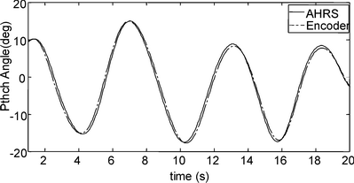 图中实线为AHRS的测量值,点划线为编码器的测量值。当测试平台以幅度约±10°的幅度摆动时。AHRS与编码器测量数据相比在时间上滞后最大不超过5 ms,峰峰值相差不超过03°。